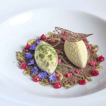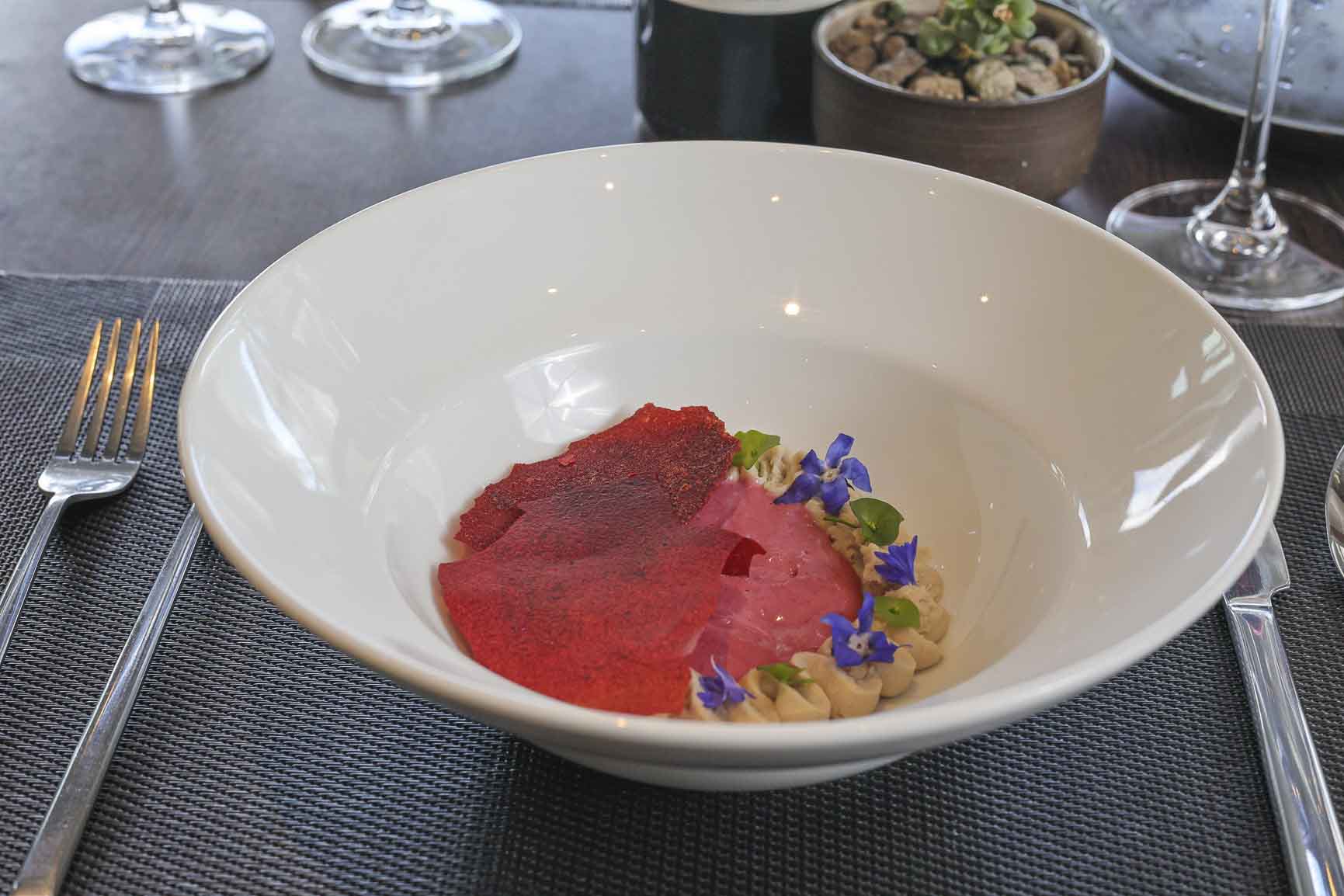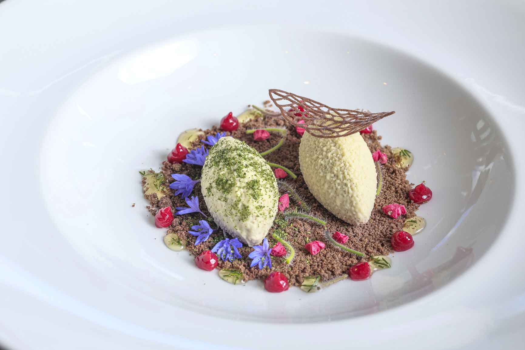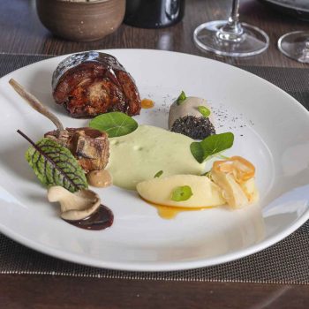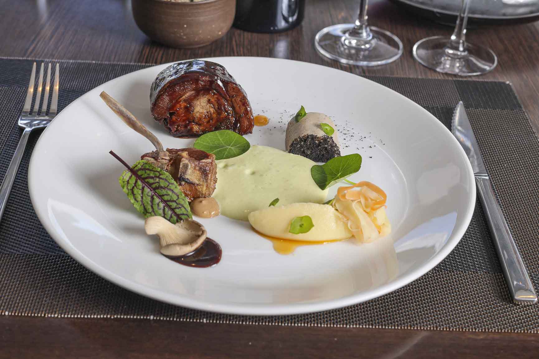 Cordero y su molleja – Cremoso y ensaladilla de chirivias orgánicas (Amarantus) – Espuma de ricota y hierbas – Texturas de gírgolas (Mykes) – Demi glacé de hongos y chocolate al 80% – Alioli de ajo negro