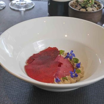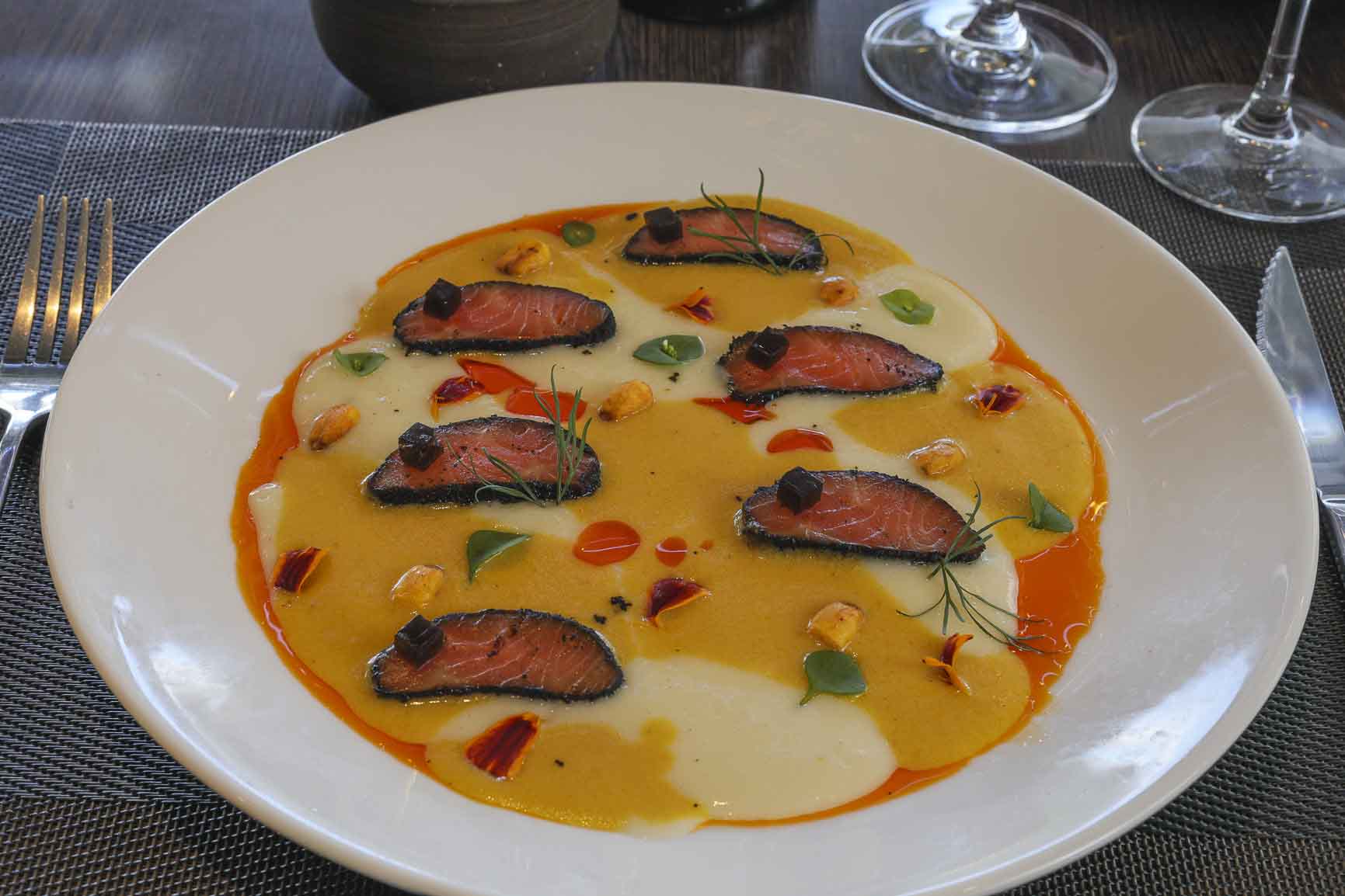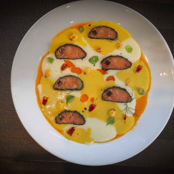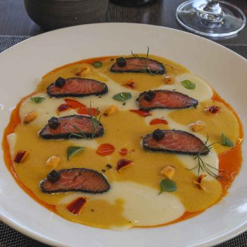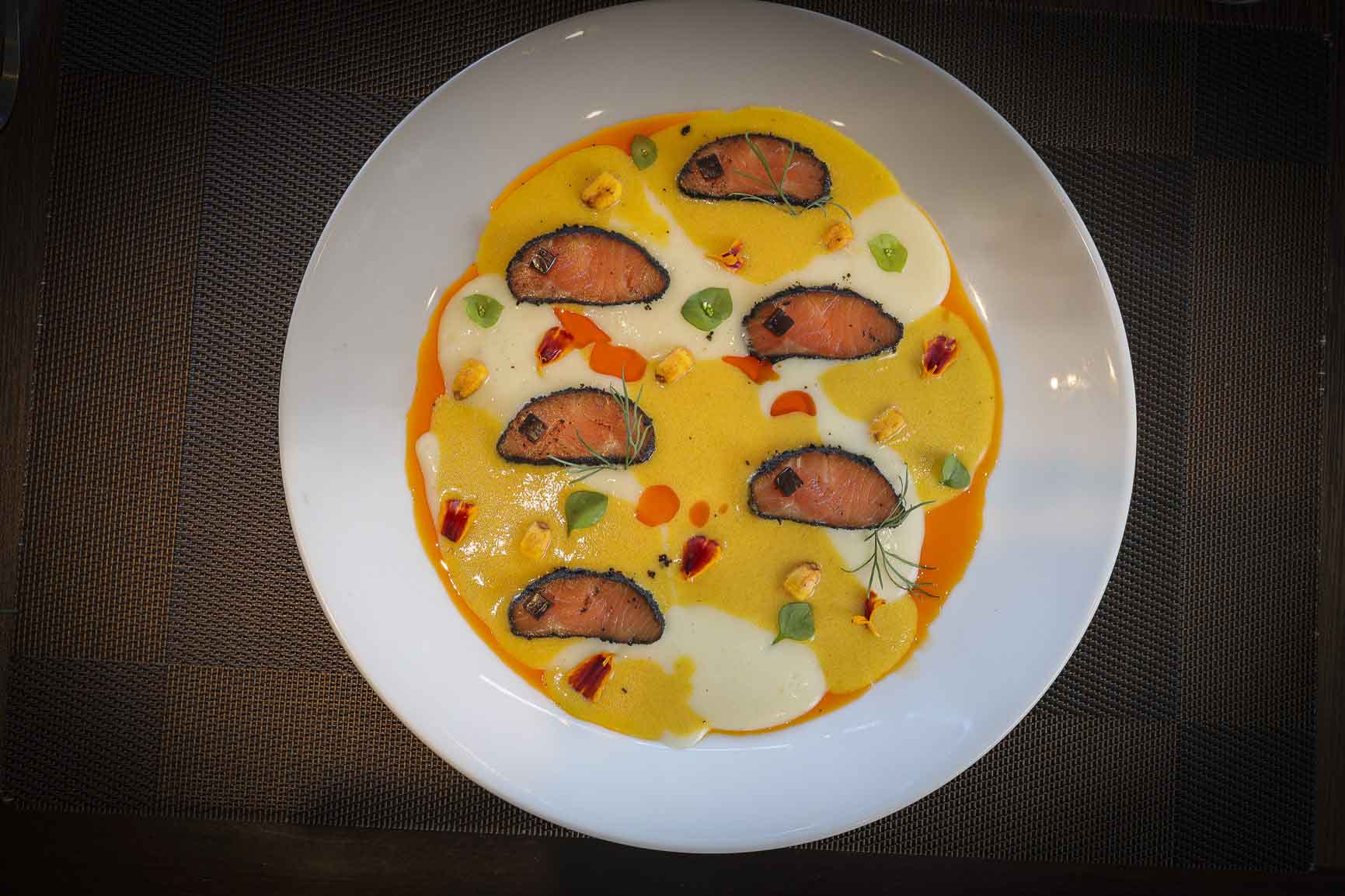 Sashimi de trucha curada y ceniza de pera – Ají amarillo – Emulsión de pera y leche de tigre – Aceite de Merkén – Gel de vinagre de sauco (Müller) – Maíz cancha