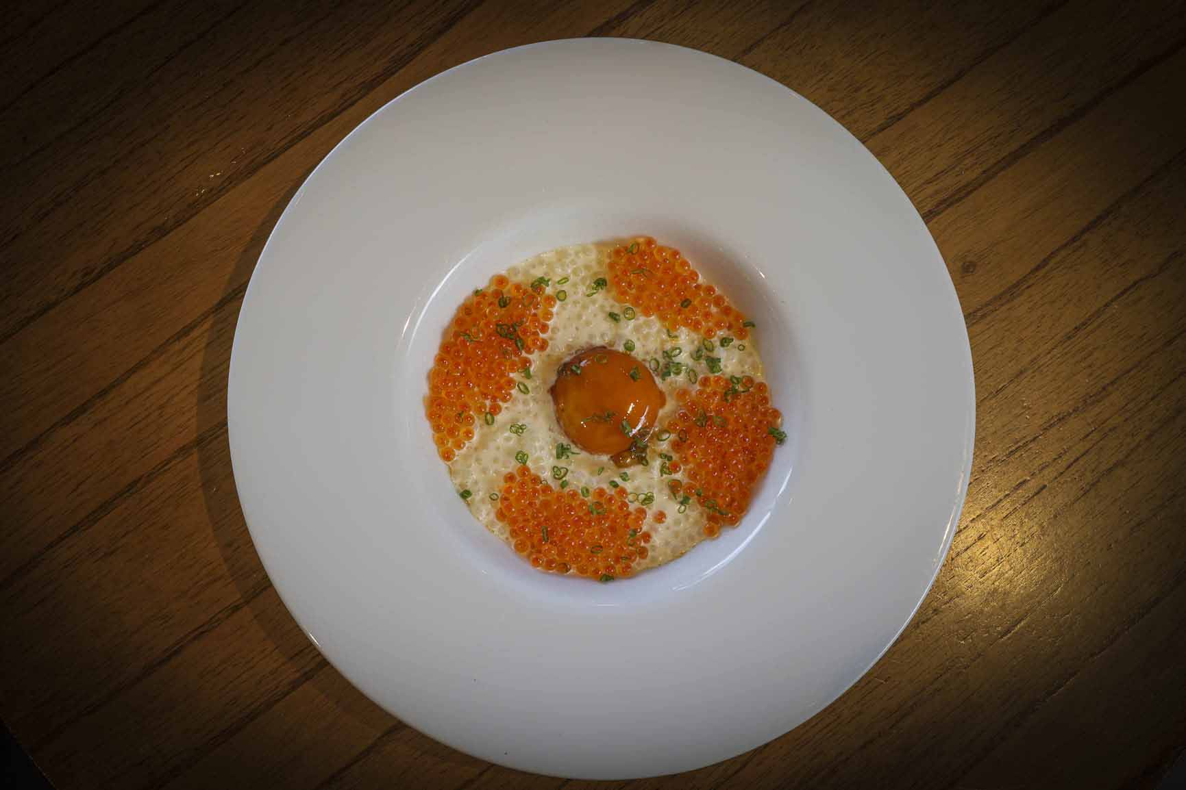 3- Chawanmushi, perlas de tapioca, yema curada y caviar de trucha.