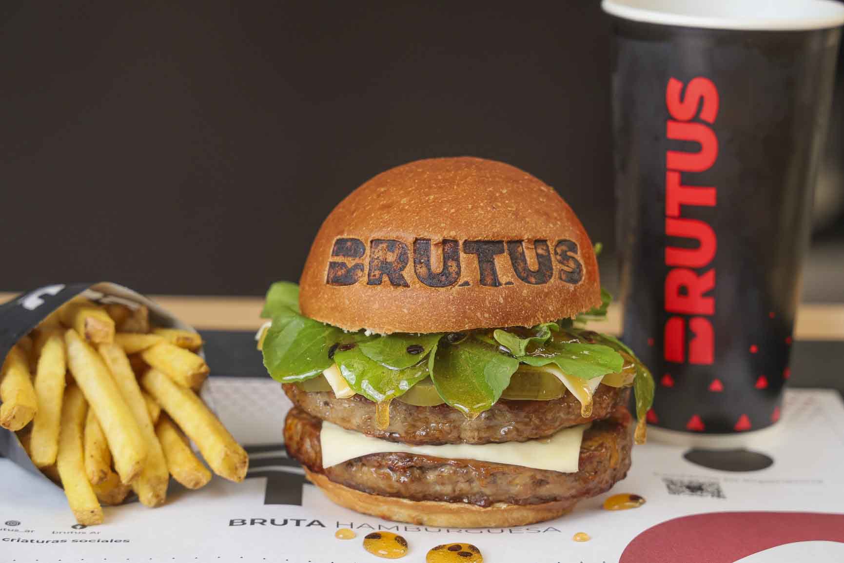 Pasión BALC: medallones de carne de 185gr, con queso provolone, rúcula, pepinillo, y salsa de maracuyá. Acompañado con papas fritas.