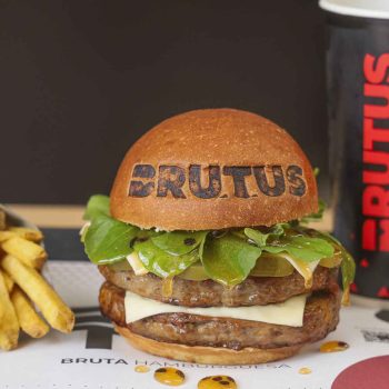 Pasión BALC: medallones de carne de 185gr, con queso provolone, rúcula, pepinillo, y salsa de maracuyá. Acompañado con papas fritas.