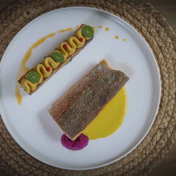 Trucha patagónica, manteca verde de la diosa, pavè de papa y apionabo, coulis de mango y lima.