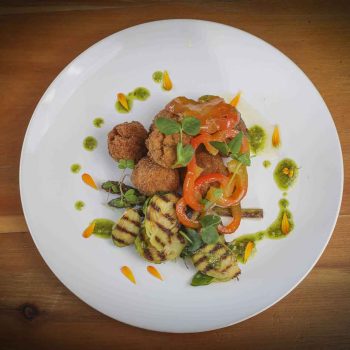 ENTRADA VEGETARIANA: Tofu dorado, hortalizas al rescoldo y cebollas encurtidas, acompañado con reducción de vino blanco en pan bao.
