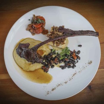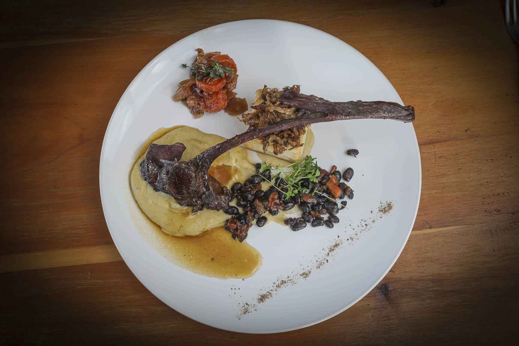 TEXTURAS DE CORDERO: Costillas de cordero braseadas, vol au vent de cordero, chutney de manzanas silvestres, cremoso de papa y puerro, porotos negros, pimientos asados y salsa demi glase.