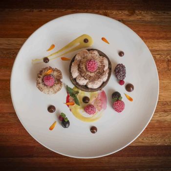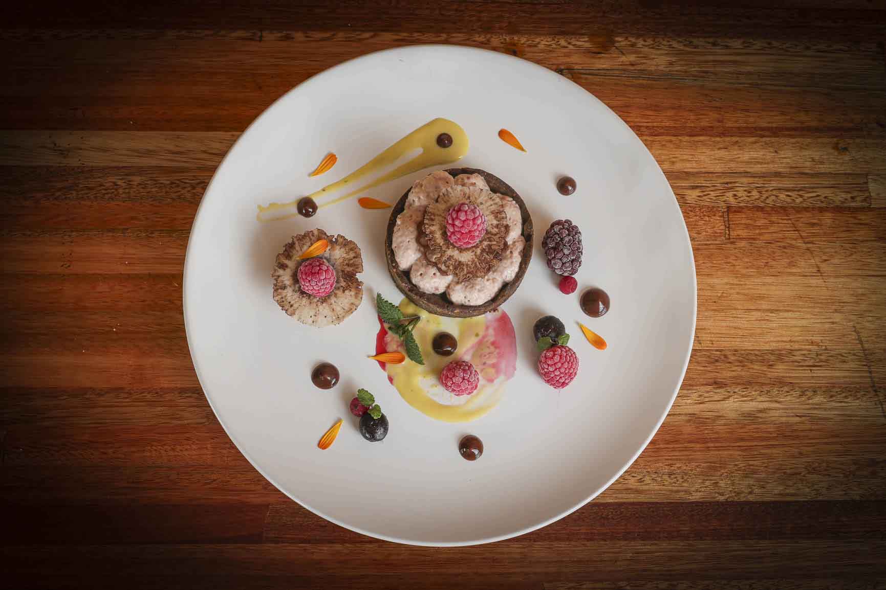 FRUTOS DEL BOSQUE Y FUNGI: Base quebrada de harina de algarroba y almendras, cremoso de frambuesa al whisky, té gelificado de cacao y rosa mosqueta, salsa de pistacho acompañado de bombones de chocolate blanco relleno de compota de hongos y frutos rojos.