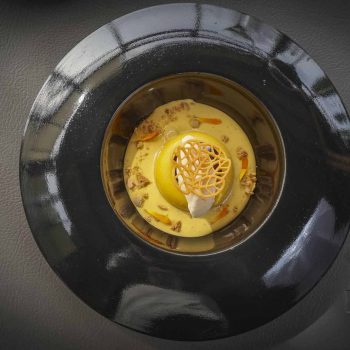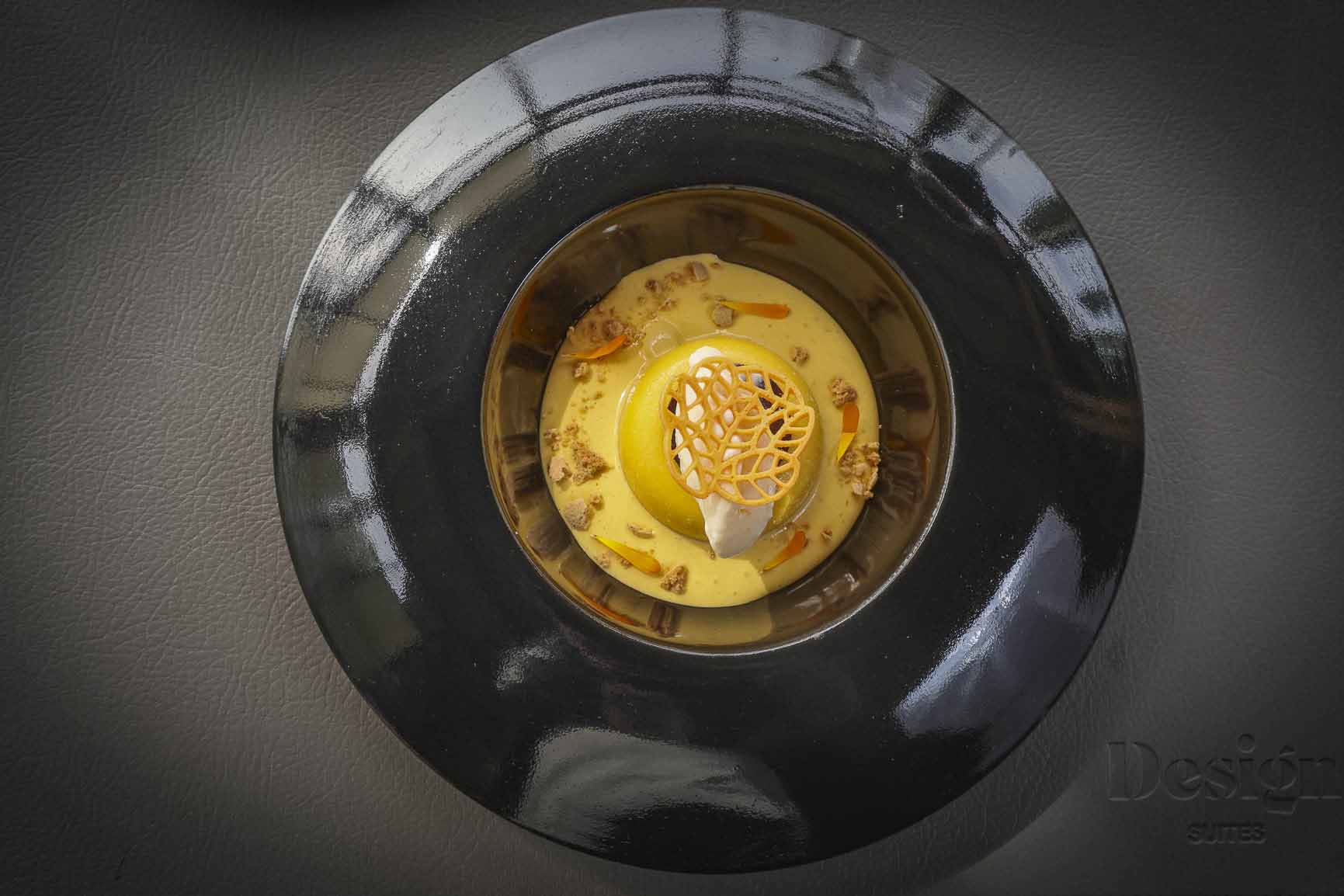 Bavaroise de cabutia, chocolate blanco, albahaca y helado de yogurt griego con amarettis.