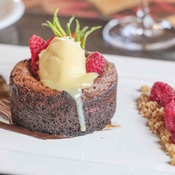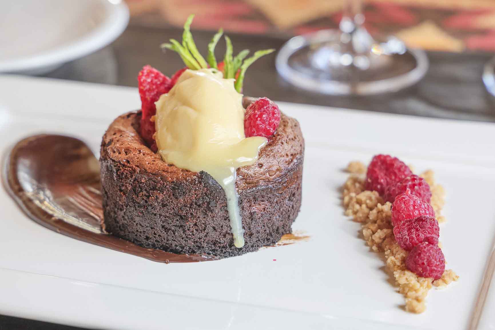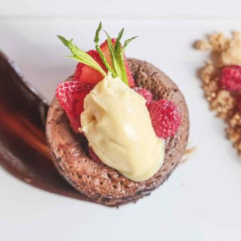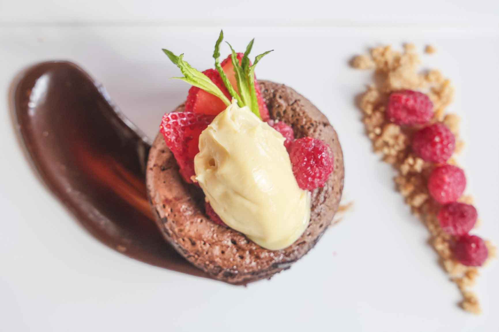 Tibio de chocolate con ganache de limón y frutos rojos.
