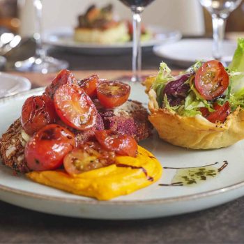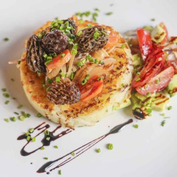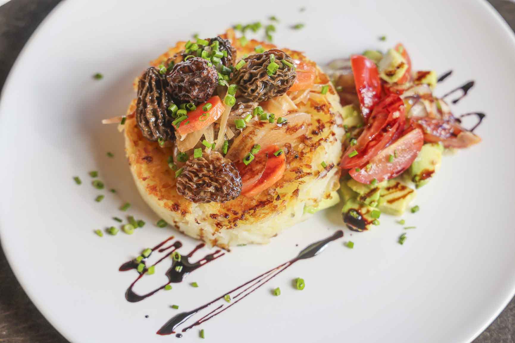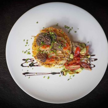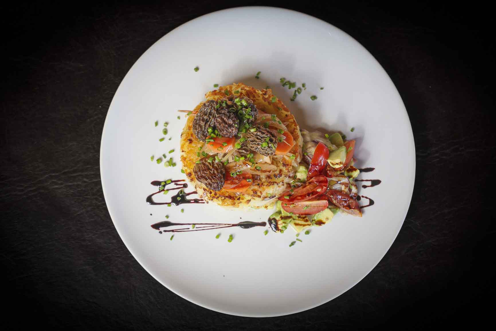 Papa Rostti con ens. de palta y escabeche de morillas.