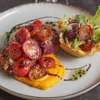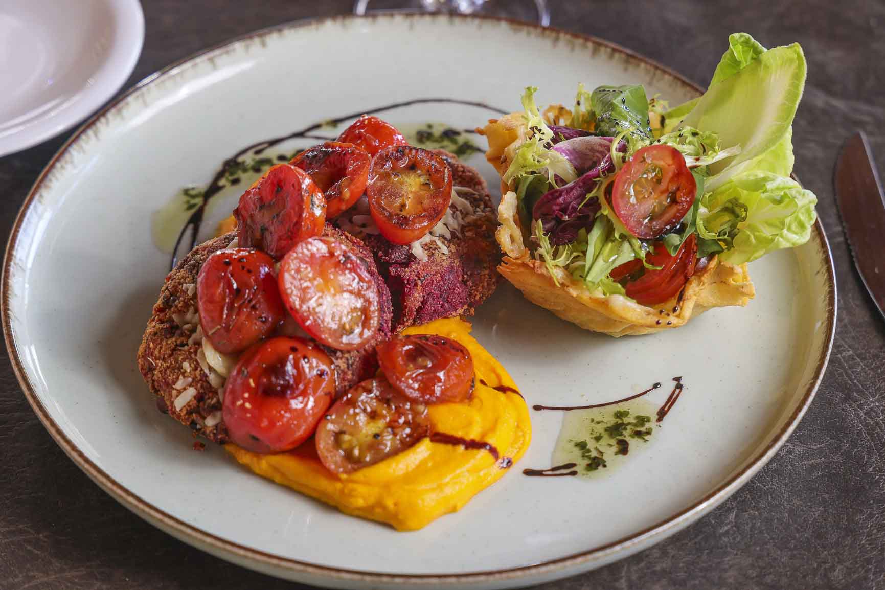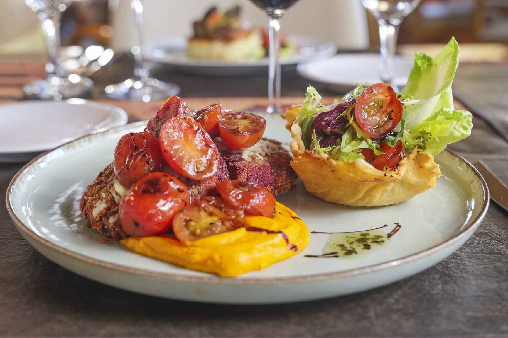 Veggies de legumbres sobre pure de zanahorias y mix de verdes.