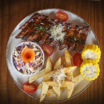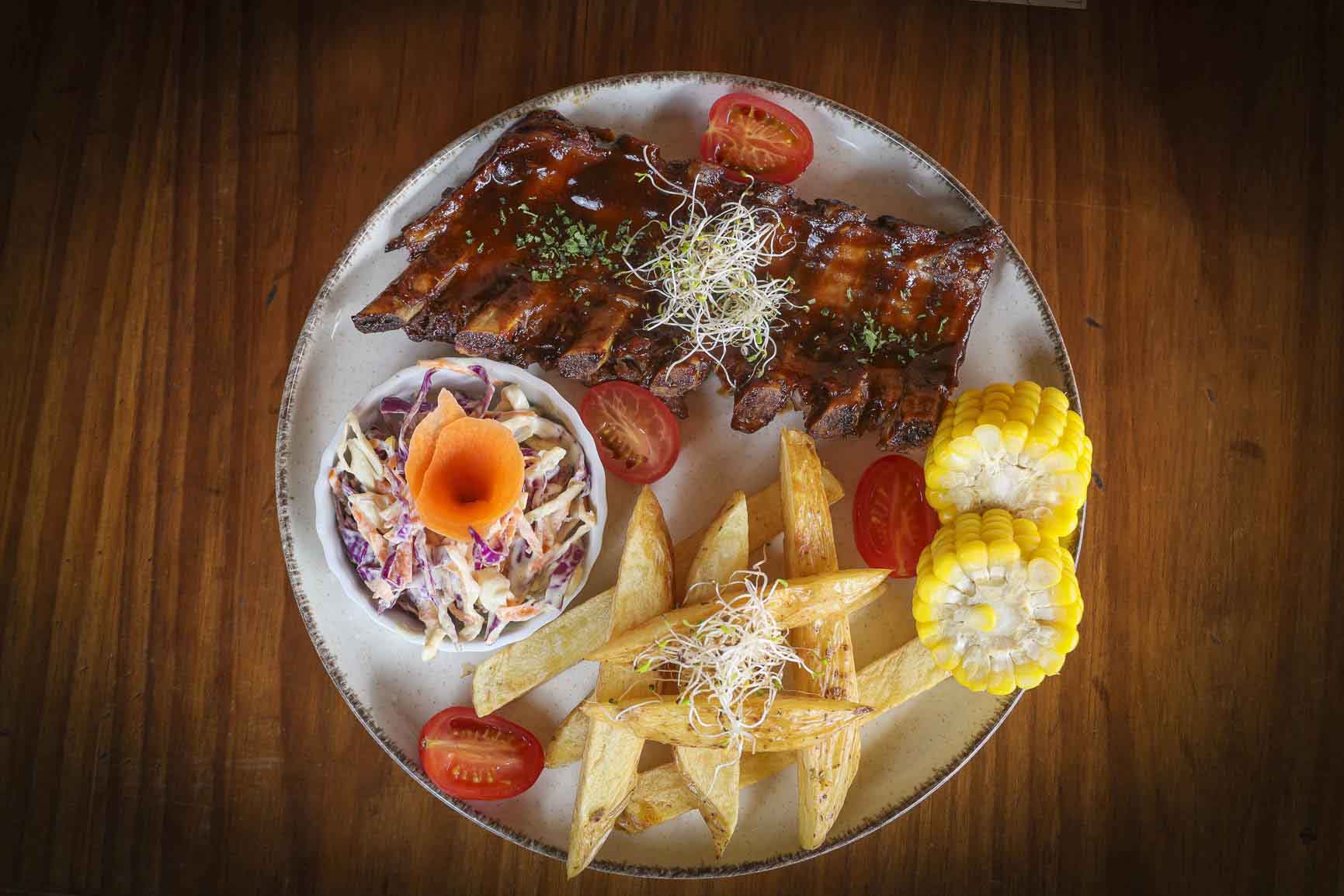 Costillas tiernas, cocidas lentamente y bañadas en salsa barbacoa casera con un sutil toque ahumado. Acompañadas de papas fritas y ensalada coleslaw fresca y cremosa.