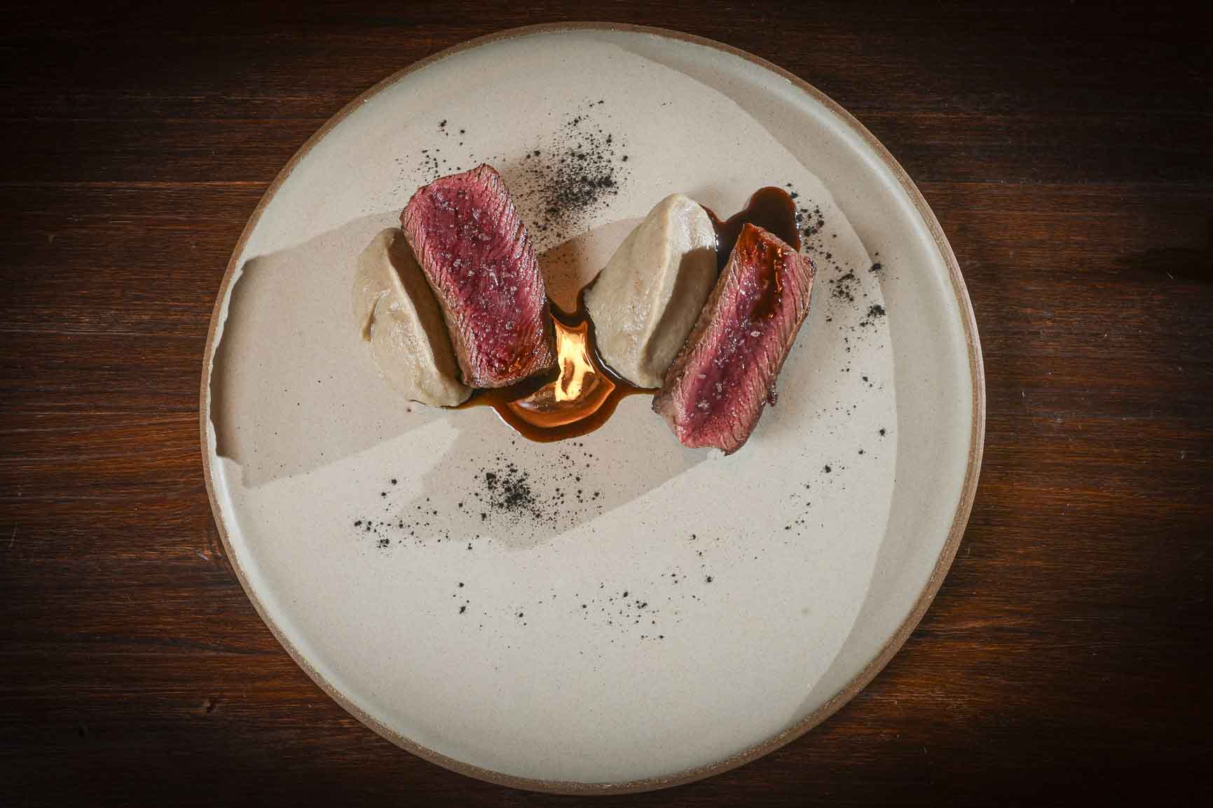Opción omnívora: Bife y demiglace de capón con puré de topinambur