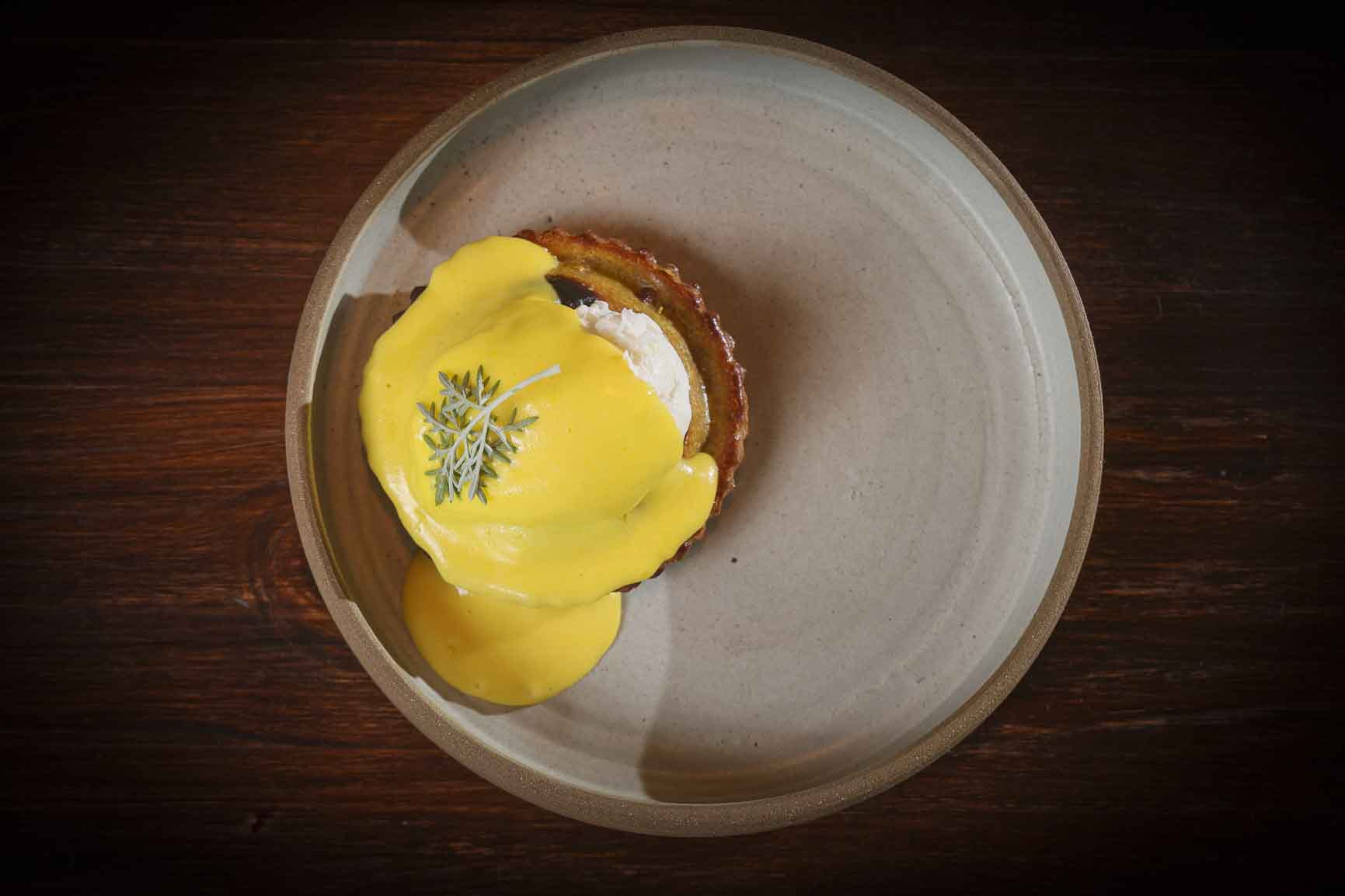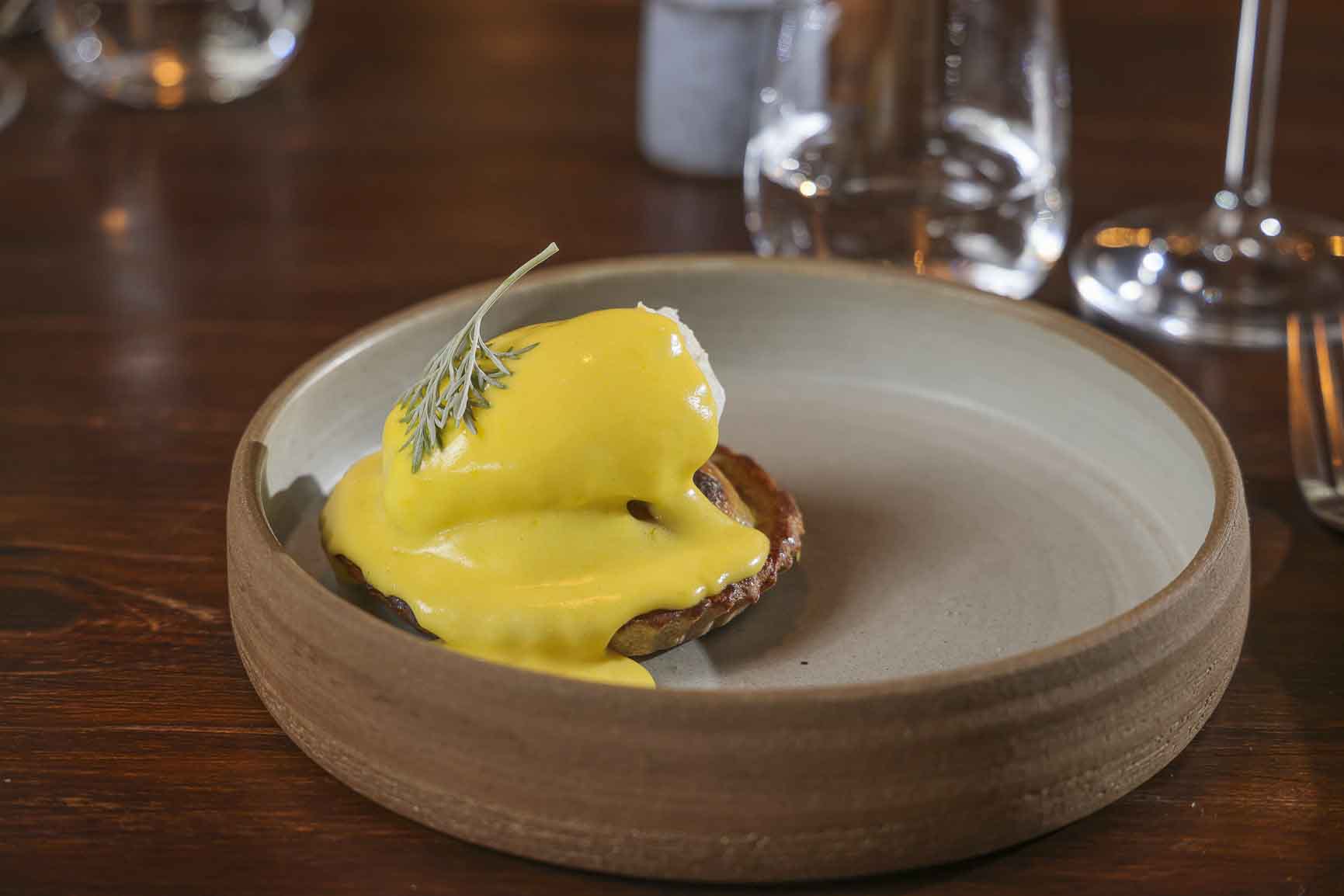 Opción omnívora / vegetariana: Pascualina reversionada elaborada con harina de trigo colorado orgánico, rellena de ricotta ahumada, peras en miel y salsa bearnesa.