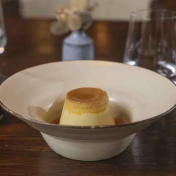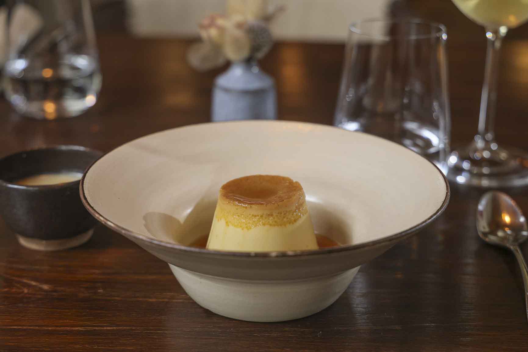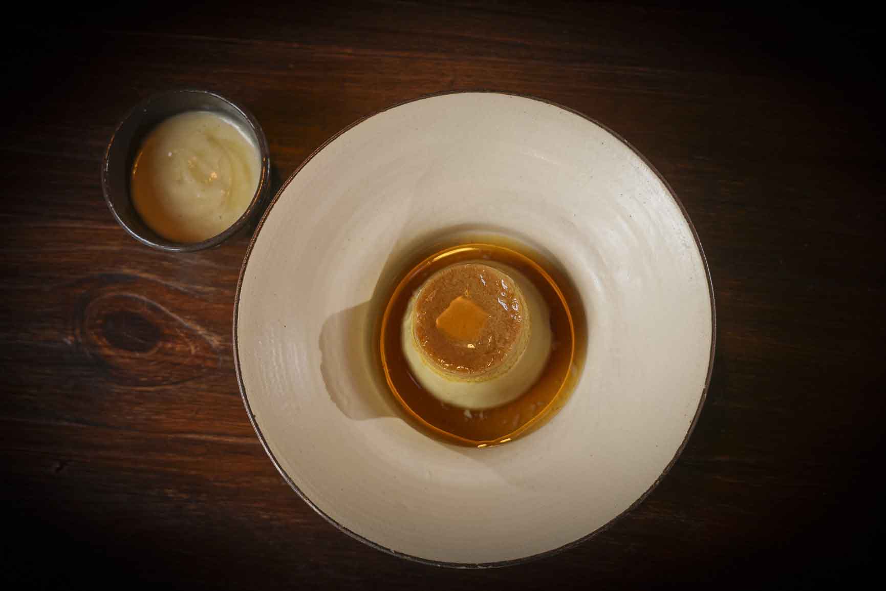 Flan a base de miel con crema de peras.