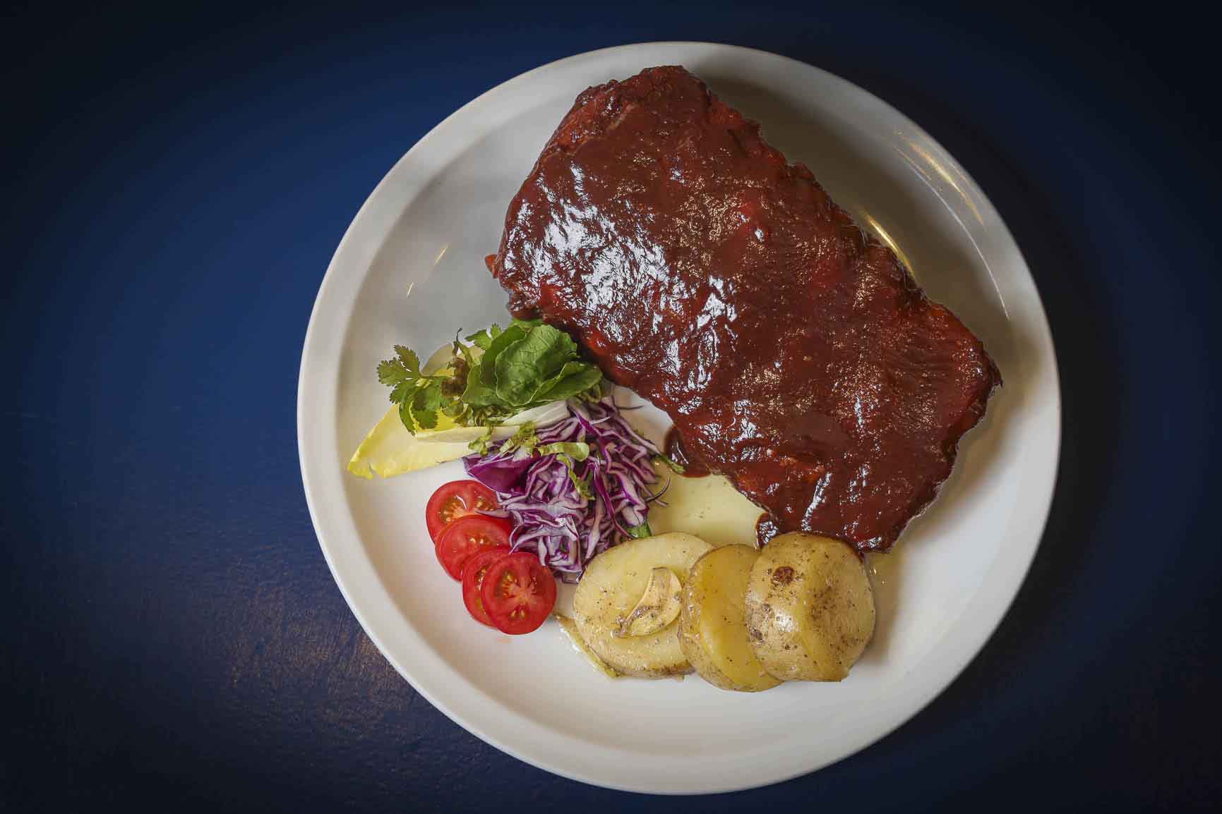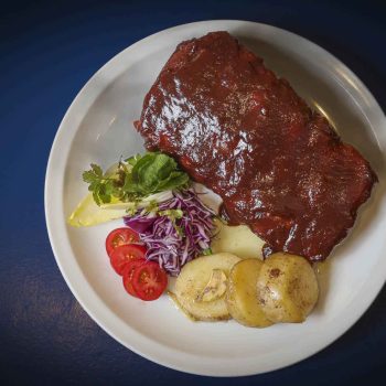 Tiernas costillas glaseadas con salsa barbacoa casera, acompañadas de una fresca ensalada agria y papa al rescoldo envuelta en papel aluminio, con mantequilla derretida que realza todo su sabor. Puedes pedirlos si te atreves, con un toque de Tabasco Chipotle! ¡Fabulantásticas!