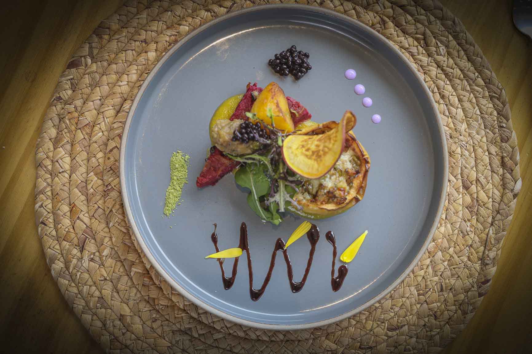 Faina de remolacha, quenelle de babaganush y esferas de sauco.