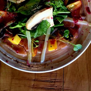 Queso y cacao, morrones asados, cobertura de ananá, furikake andino y salsa de remolacha. Intenso, ahumado y vibrante.