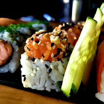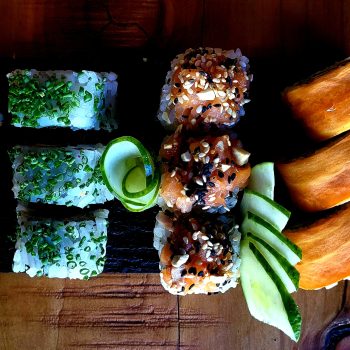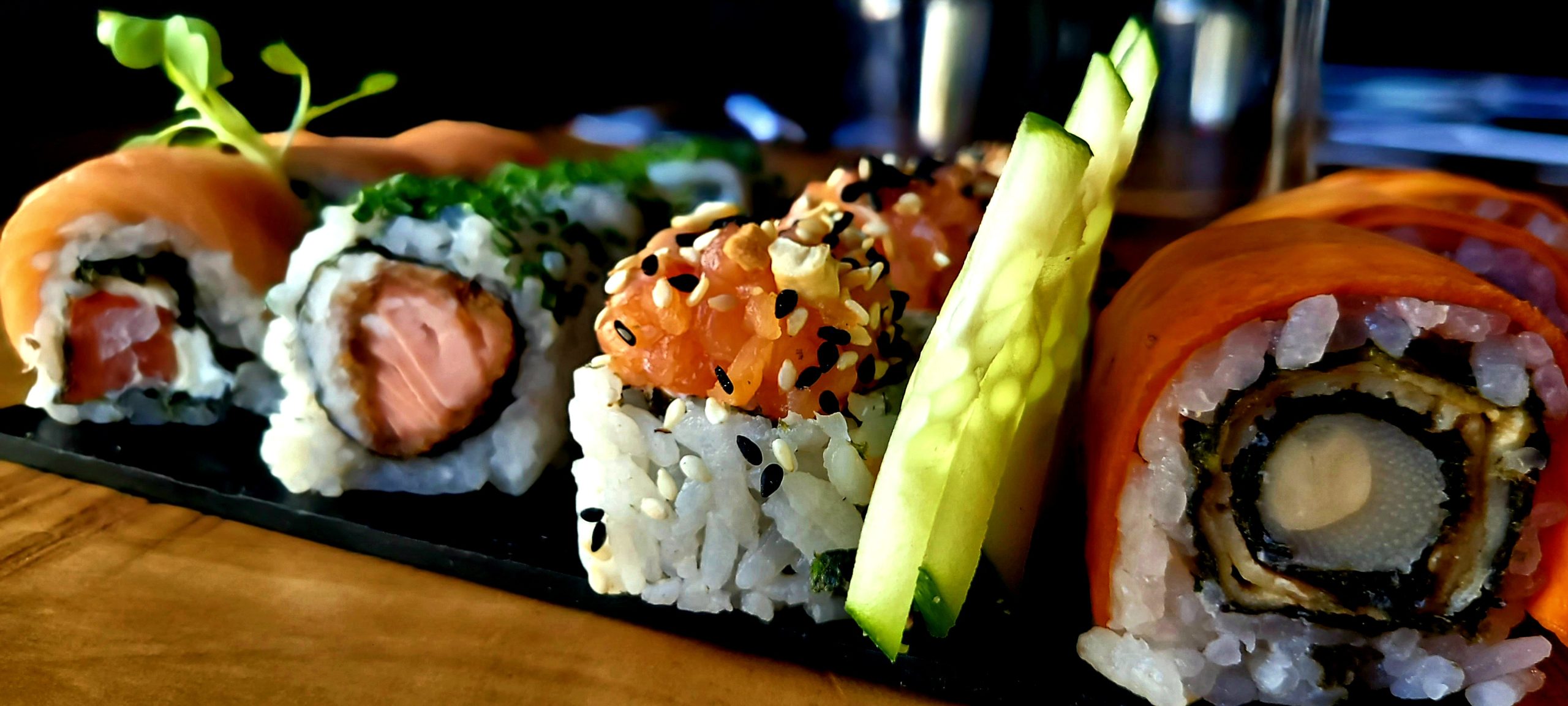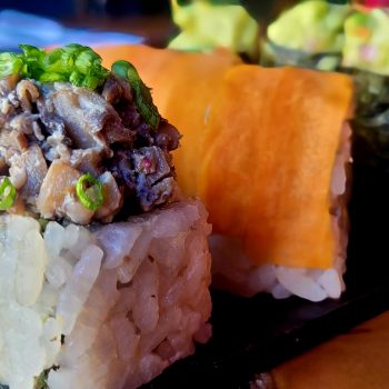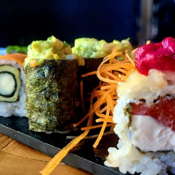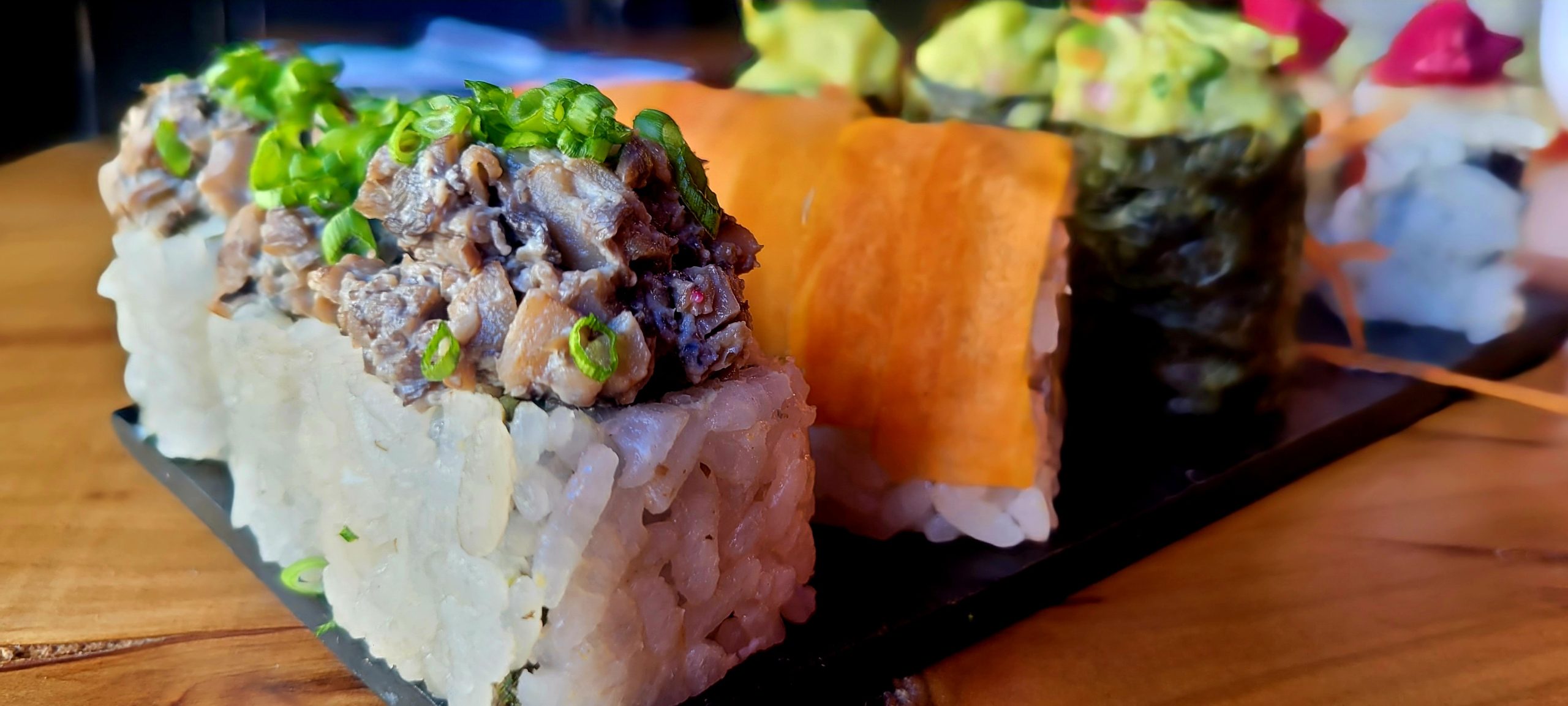 Gunkan de alga nori relleno con guacamole casero, coronado con botes patagónicos